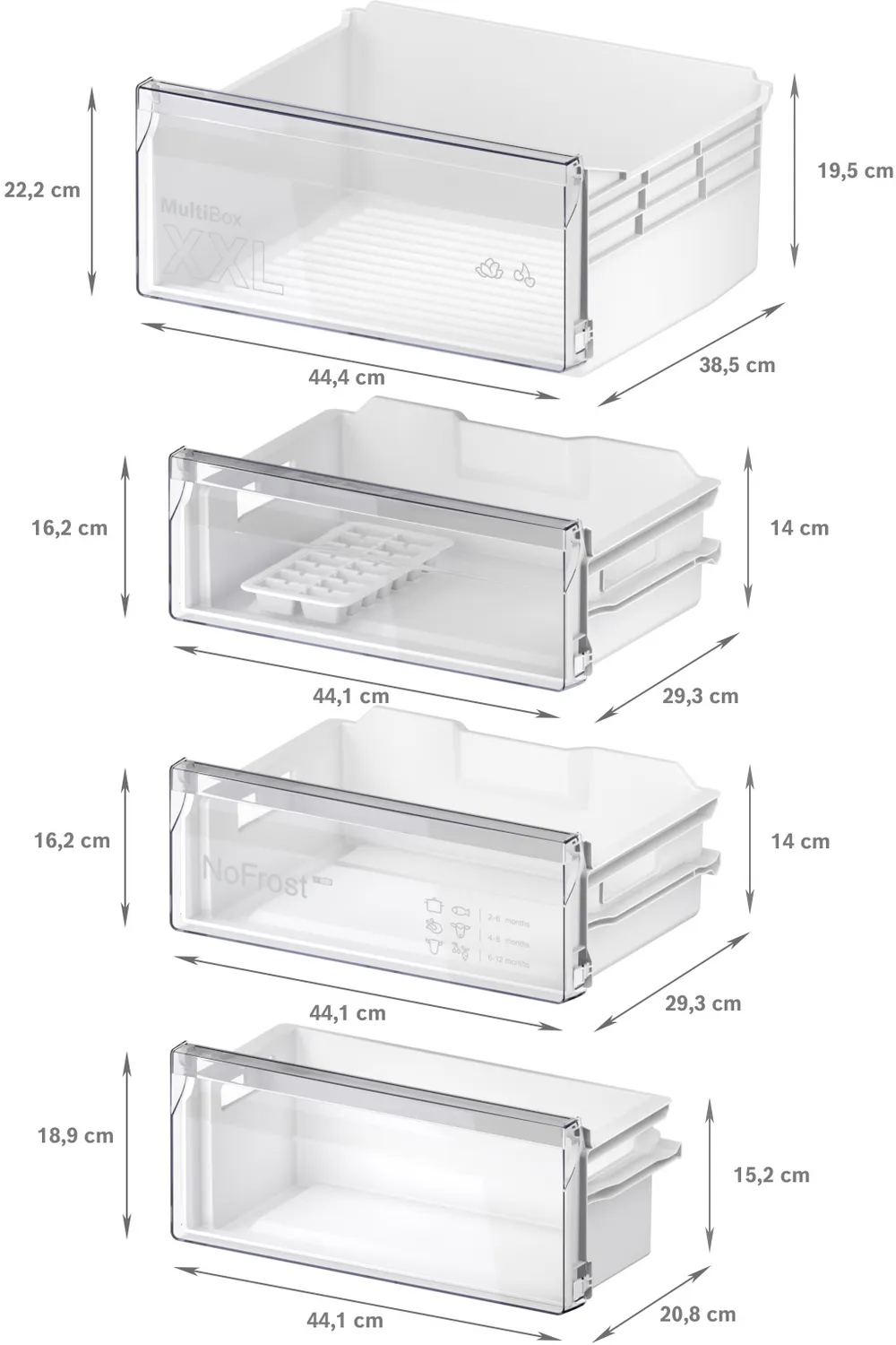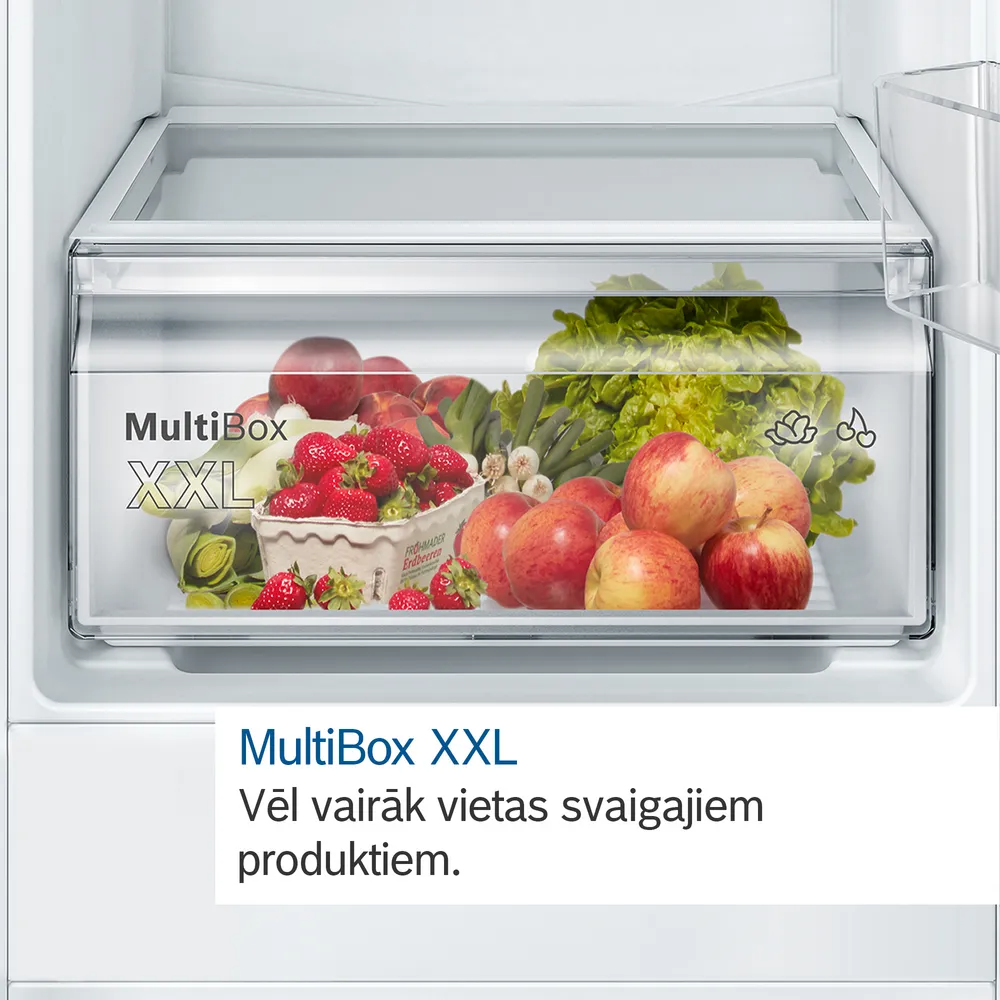 Dārzeņu un augļu uzglabāšana vēl nekad nav bijusi tik vienkārša. Mūsu MultiBox XXL īpaši lielais nodalījums nodrošina ievērojami vairāk vietas svaigajiem augļiem un dārzeņiem. Tas ir īpaši noderīgi, kad vēlies nodrošināties ar svaigo salātu rezervēm vai atdzesēt arbūzu savam nākamajam izbraucienam uz jūru.