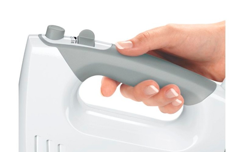 Droša un ērta lietošana.Ergonomiska un droša miksera lietošana, pateicoties rokturim ar mīkstu gumijas pārklājumu, kas viegli un ērti iegulst plaukstā. Satvēriens ir drošs neatkarīgi no izvēlētā ātruma iestatījuma. Baudiet vienkāršu miksera lietošanu pat tad, kad jāmīca blīvi mīklas maisījumi. Miksera lietošana ir vienkārša un rokas nenogurst.