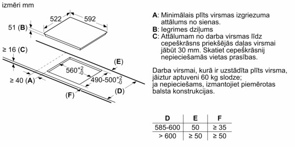 Nepieciešamais nišas izmērs uzstādīšanai (AxPxD mm) : 51 x 560 x (490–500)