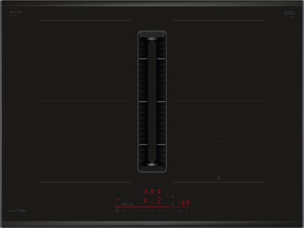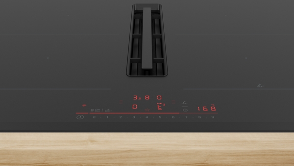 Integrētais ventilācijas modulis apvieno sevī labāko no mūsu indukcijas plīts virsmām un tvaika nosūcējiem. Tā kā tas ir iebūvēts plīts virsmā, tas savāc gatavošanas smaržas un tvaiku tieši tur, kur tie sākas. Tādējādi vairs nav nepieciešams atsevišķs tvaika nosūcējs, un tev ir vairāk vietas virs galvas skapīšiem un plauktiem – vai arī vienkārši brīvs skats pāri virtuvei.