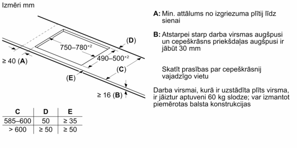 • Nepieciešamais nišas izmērs uzstādīšanai (AxPxD mm) : 51 x 750 x (490–500)