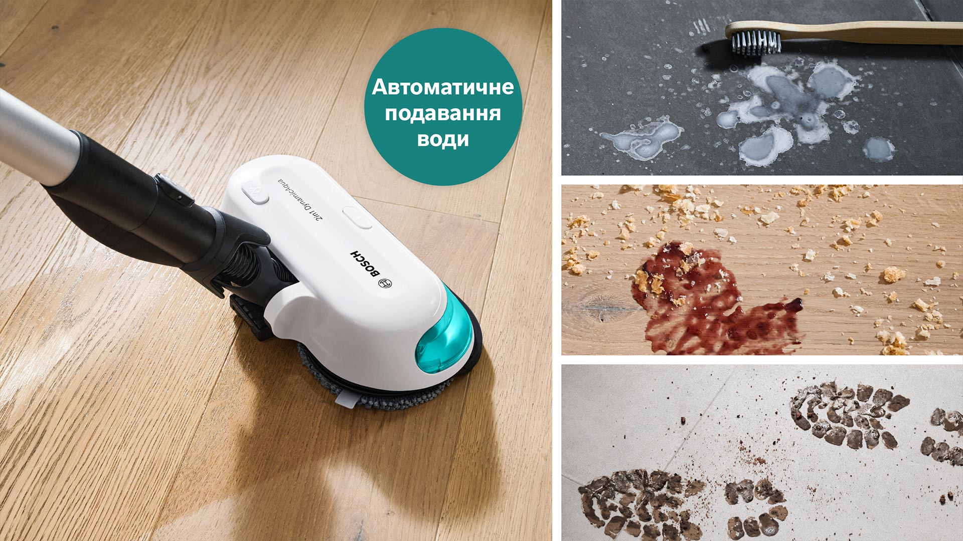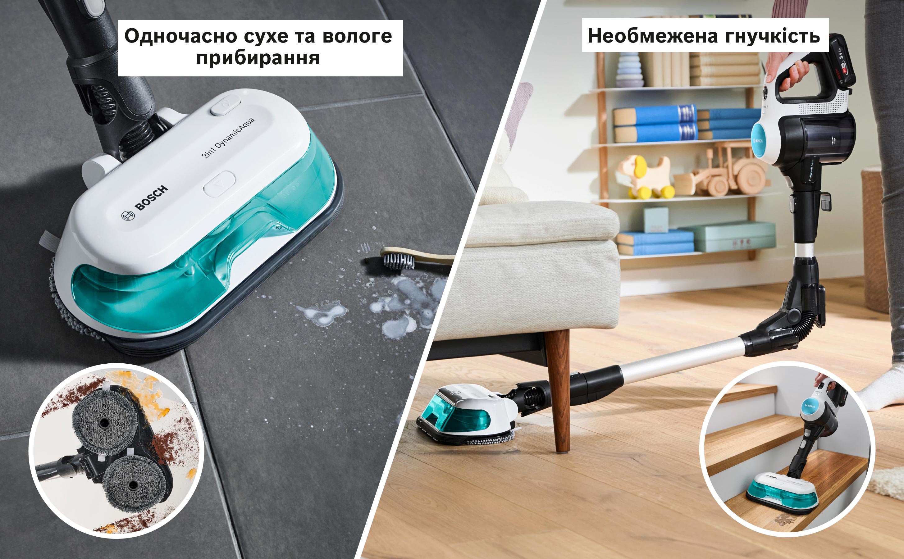 Efektīva sausā un mitrā tīrīšana ar vienu kustību — vienkāršs veids, kā izbaudīt tīru, sausu un mitru tīrīšanu, notiek vienlaikus ar 2in1 DynamicAqua uzgali sausai un mitrai tīrīšanai