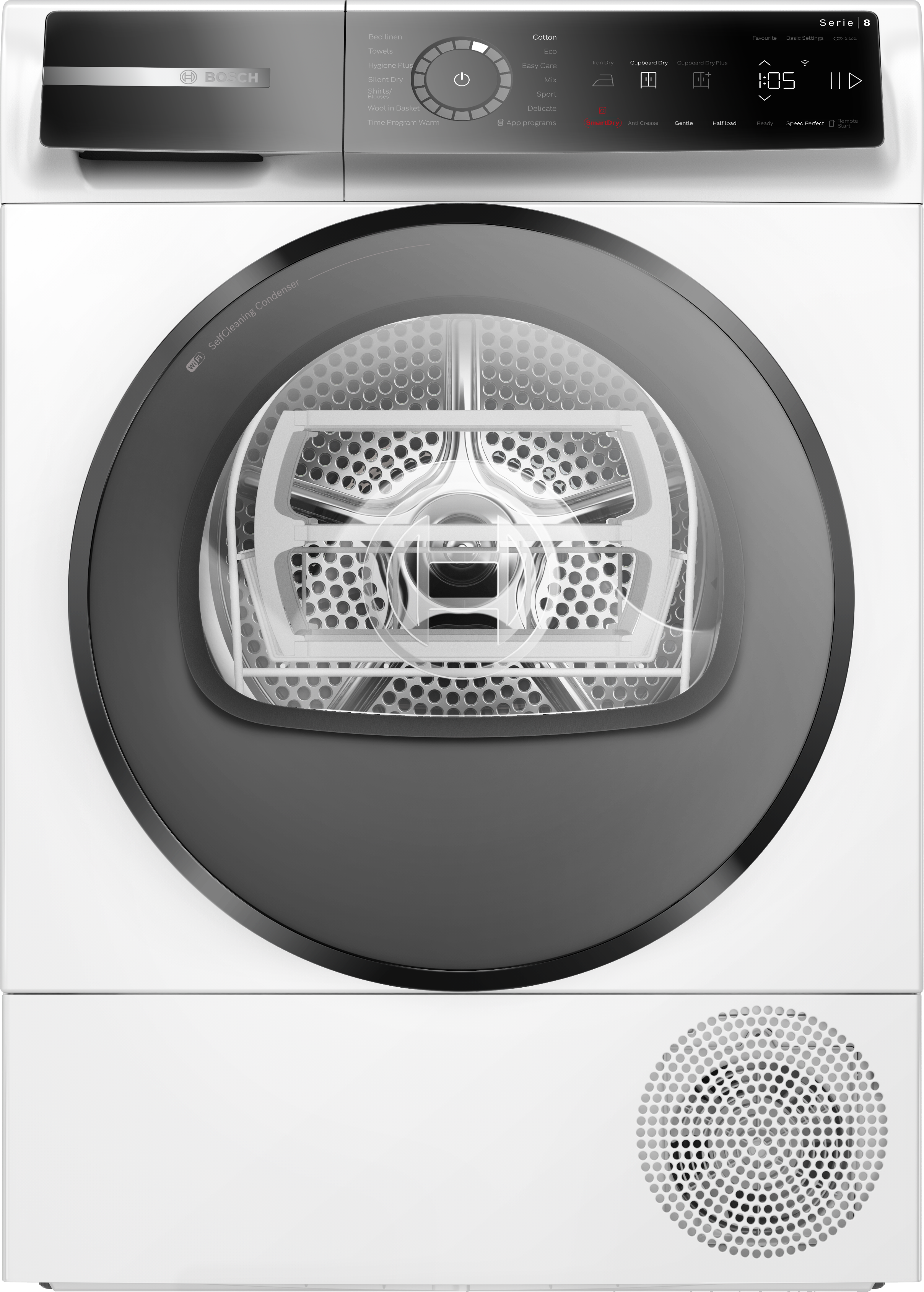 Speciālas programmas: App, Kokvilna, Bed linens, Krekl/blūzes, Cotton Eco, Jauktā veļa, Dvieļi, Hygiene, Jaukta veļa, Night Dry, Sporta drēbes, Sintētika, Vilnas žāvēšana grozā, Siltas žāvēšanas laika programma